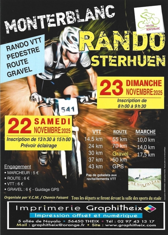 VTT – 6 euros (14,5-24-30-37 et 43 km) – Marche – 5 euros (10 – 14 et 17,5 km)
