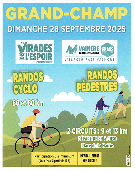 Randonnées cyclos « Hubert Corfmat » avec le Cyclo Grand-Champ : deux circuits de 50 et 80 km. Départ groupé à 8h30.